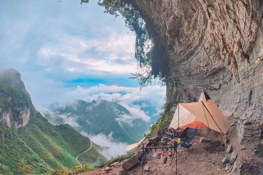 - Vách đá trắng (Đèo Mã Pí Lèng): Đây là địa điểm dành cho những người ưa mạo hiểm. Nằm trên cung đường đi bộ phía trên đèo Mã Pí Lèng, vách đá trắng cung cấp một tầm nhìn toàn cảnh xuống hẻm vực Tu Sản. Cắm trại tại đây, bạn sẽ có cảm giác như đang lơ lửng giữa trời xanh. Tuy nhiên, diện tích bằng phẳng khá hạn chế, bạn cần đến sớm để giữ chỗ.